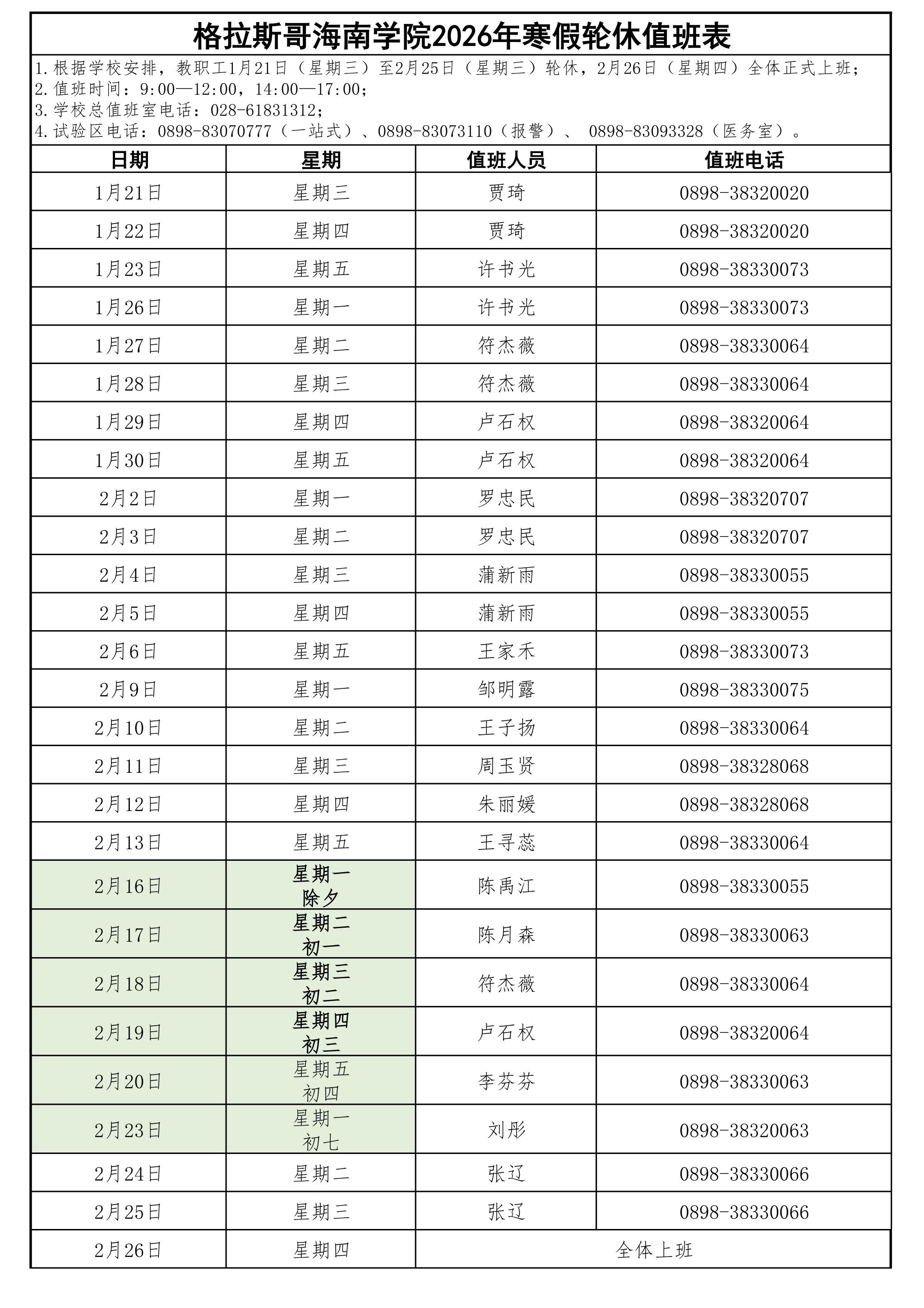格拉斯哥海南学院2026年寒假轮休值班表