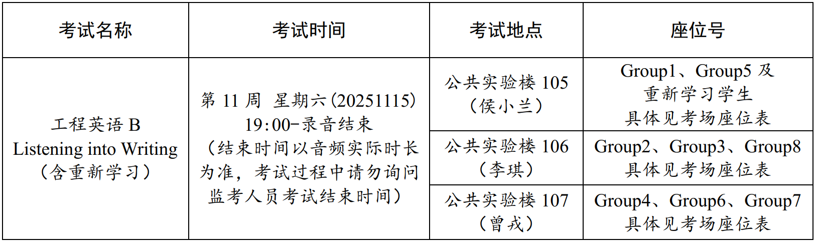现将2025-2026-1学期《工程英语B》(含重新学习)“Listening into Writing”测试安排通知如下: