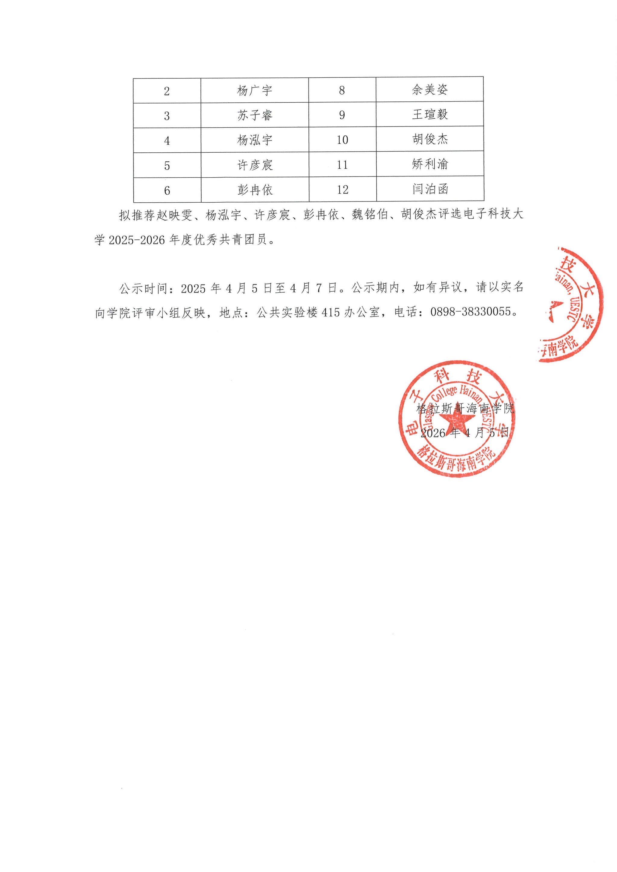 关于格拉斯哥海南学院2025-2026年度“两红两优”评选结果的公示