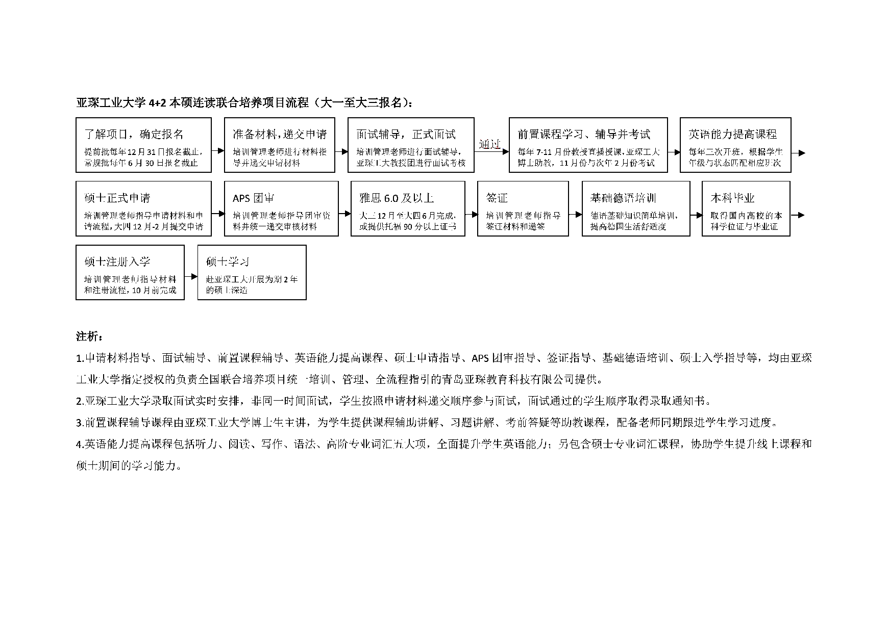 了解项目,确定报名→准备材料,递交申请→面试辅导,正式面试→(面试通过后)前置课程学习、辅导并考试→英语能力提高课程→硕士正式申请→APS团审→雅思6.0及以上→签证→基础德语培训→本科毕业→硕士注册入学→硕士学习