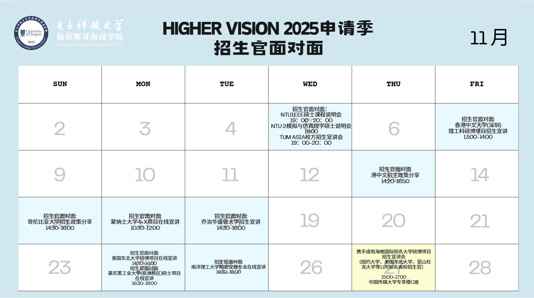 结合留学指导服务季,11月格拉斯哥海南学院留学指导中心重磅推出:“2025申请季招生官面对面”系列活动,将继续为同学们安排多场线上与线下的国际知名高校招生官宣讲会,助力2025申请季的留学规划。这些宣讲会将帮助同学们全面了解海外深造的各项关键信息。